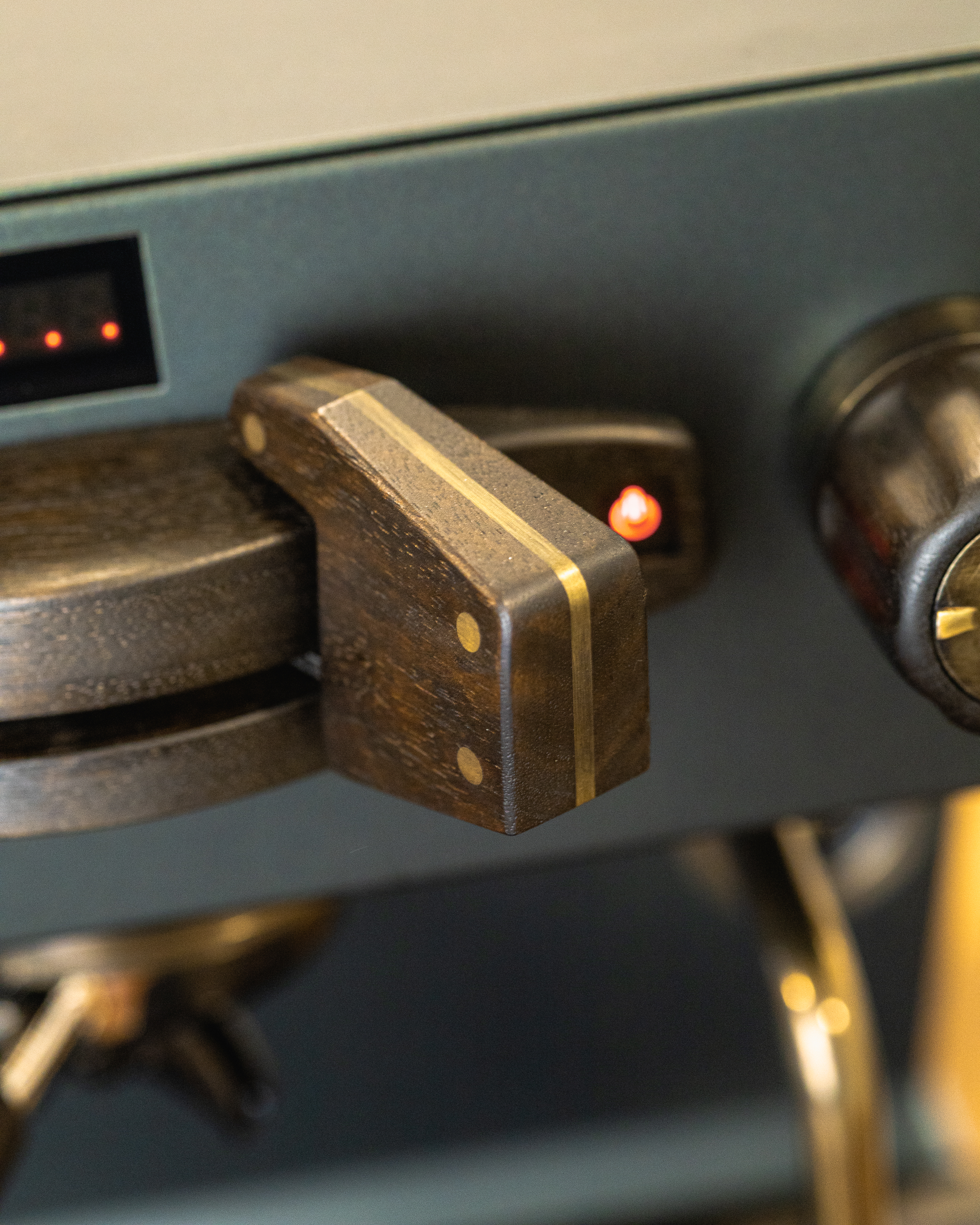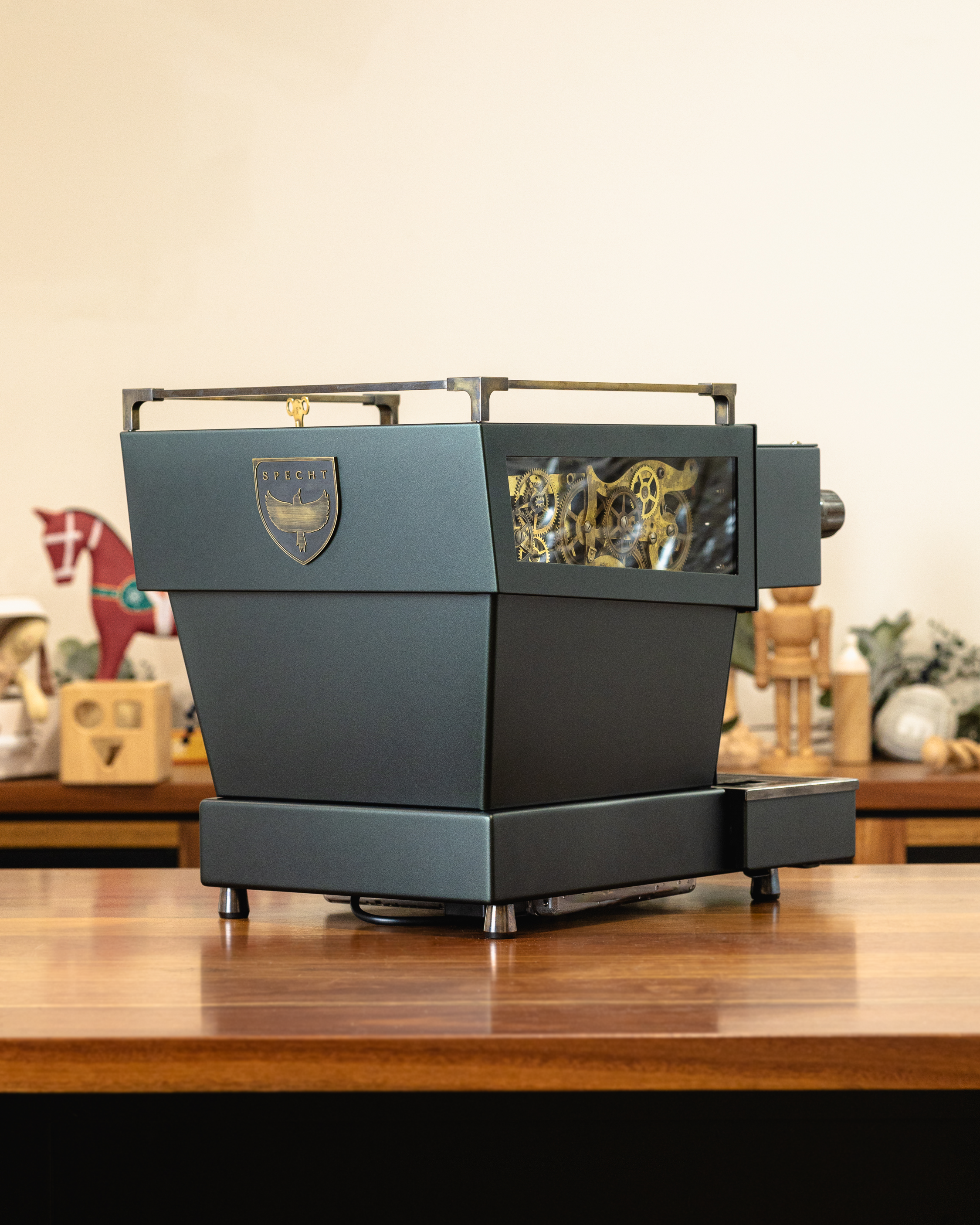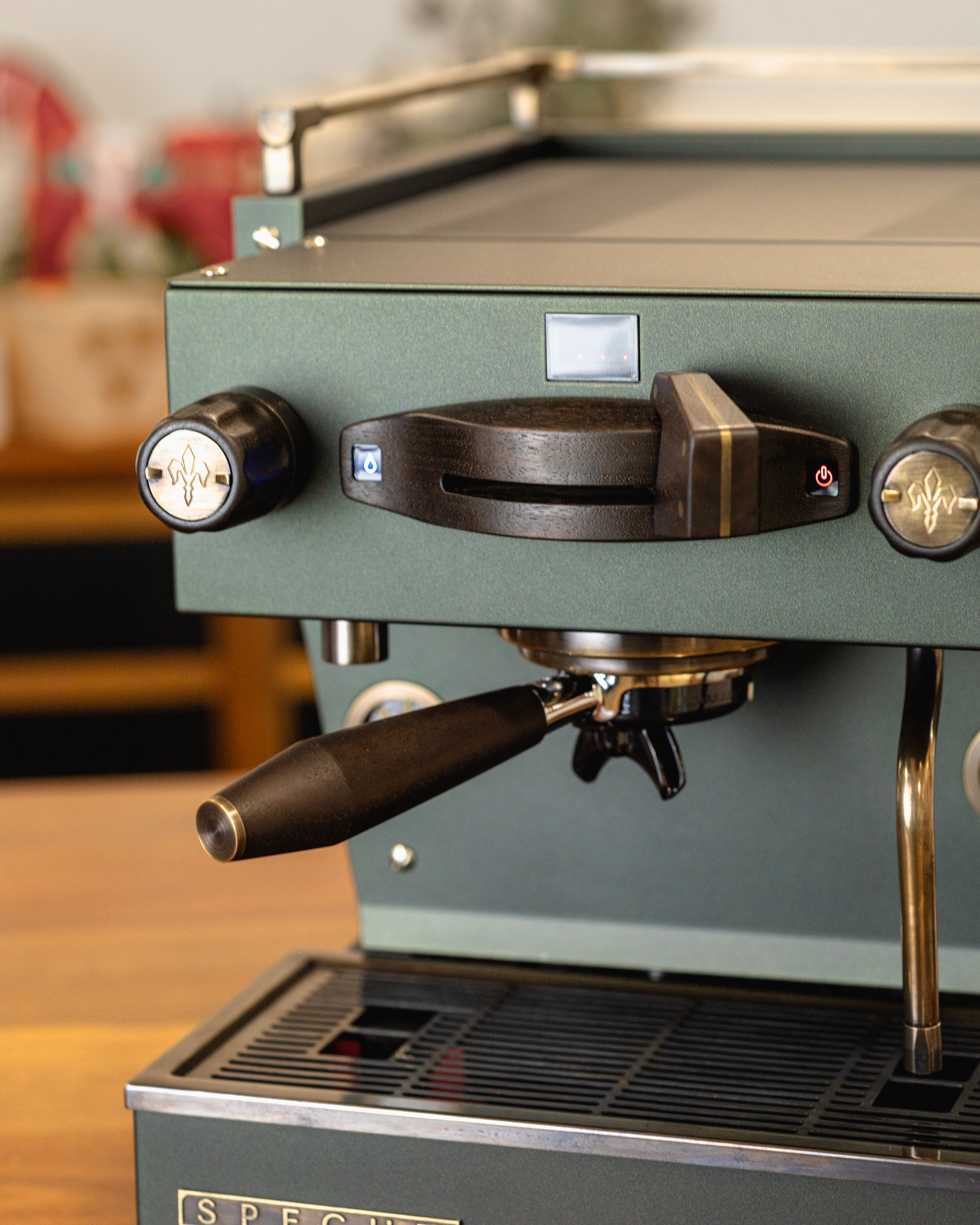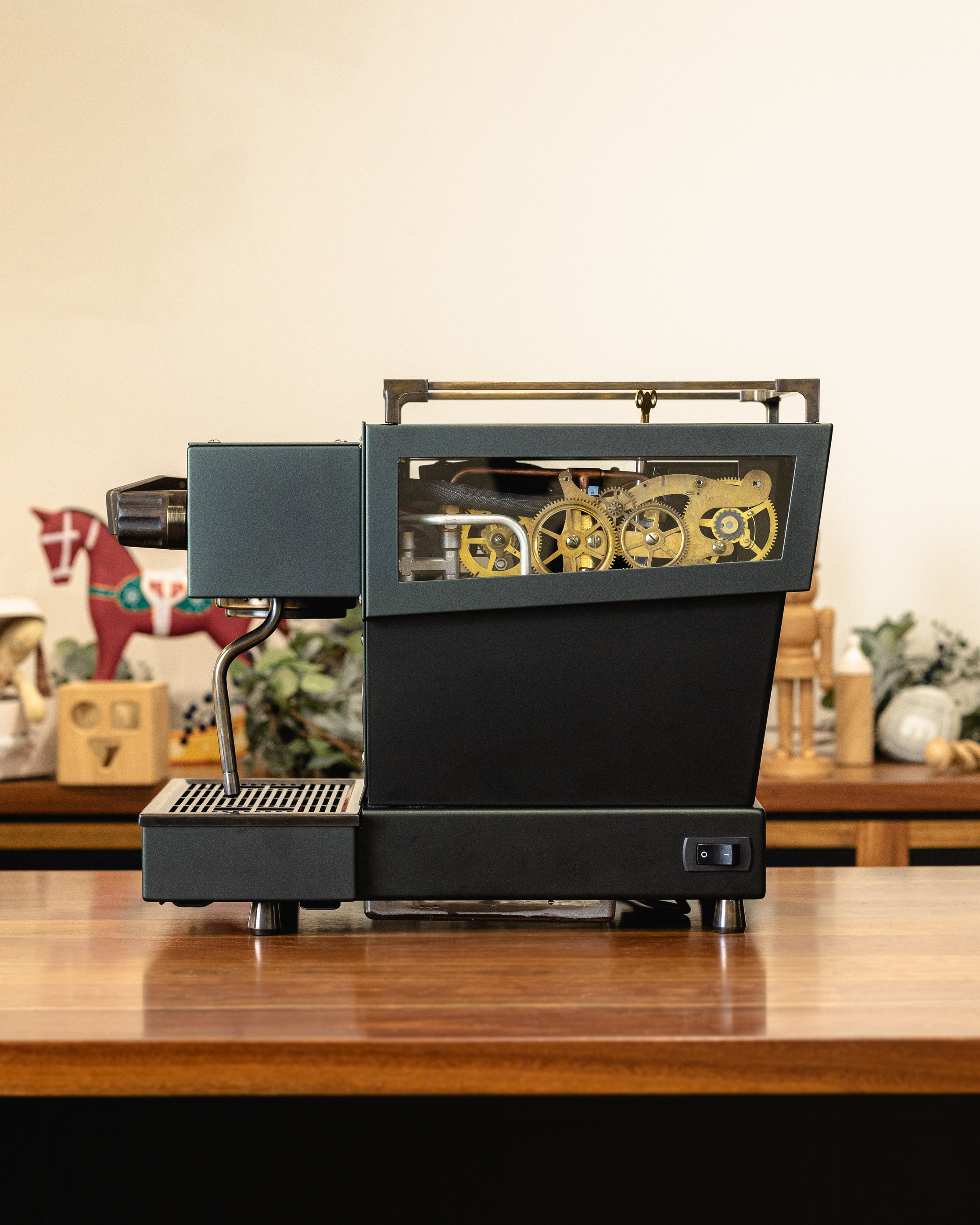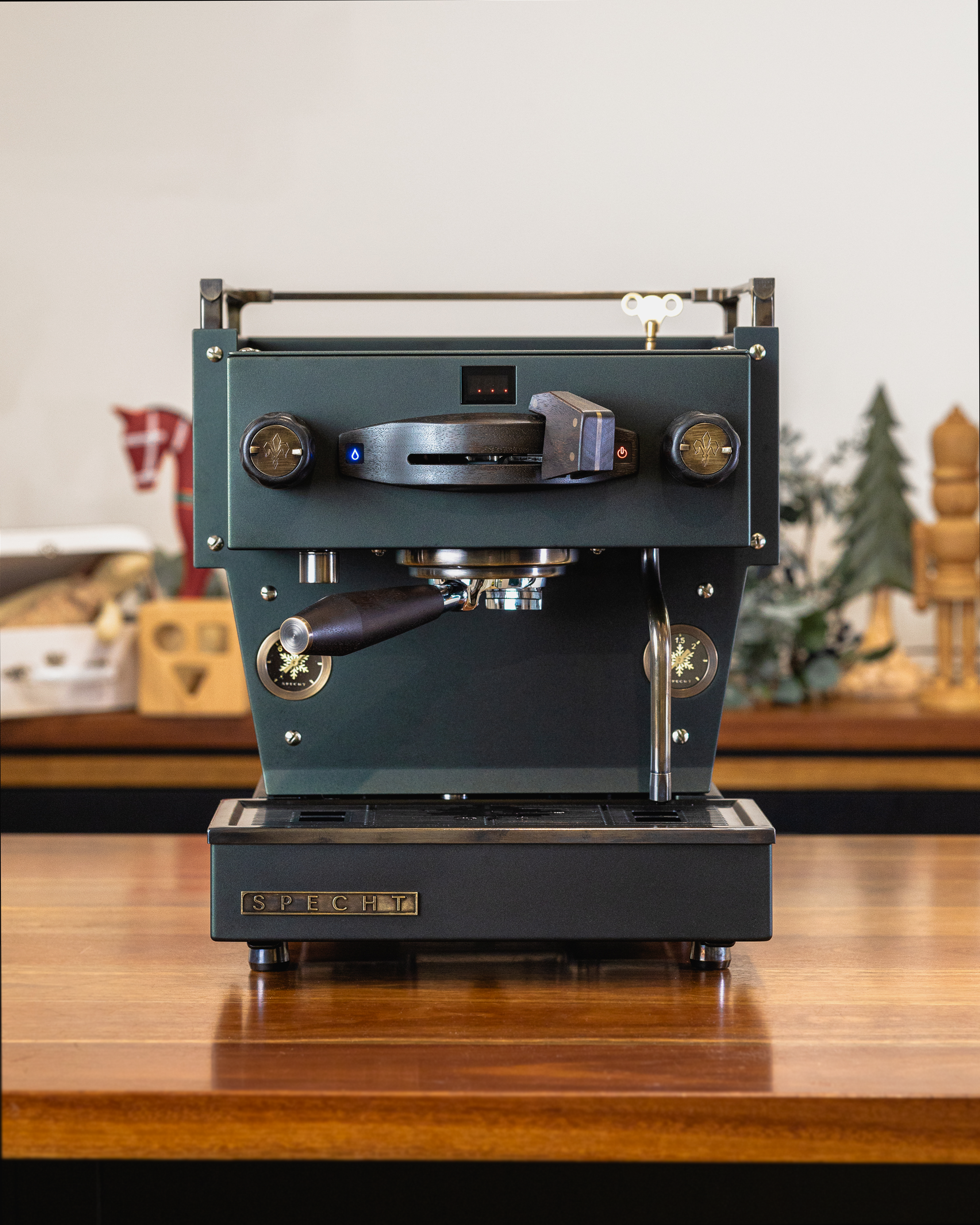 This reimagined Linea Mini R redefines the Christmas palette with a deeper, moodier matte metallic green finish. The aged bronze and smoked walnut accents add timeless character, reminiscent of time-tested tools, weathered through years of service. For a truly magical touch, peer through its glass windows and you will find bronze cogs repurposed from a 19th-century Seth Thomas clock, representing the countless moving parts it takes to bring the holidays to life.