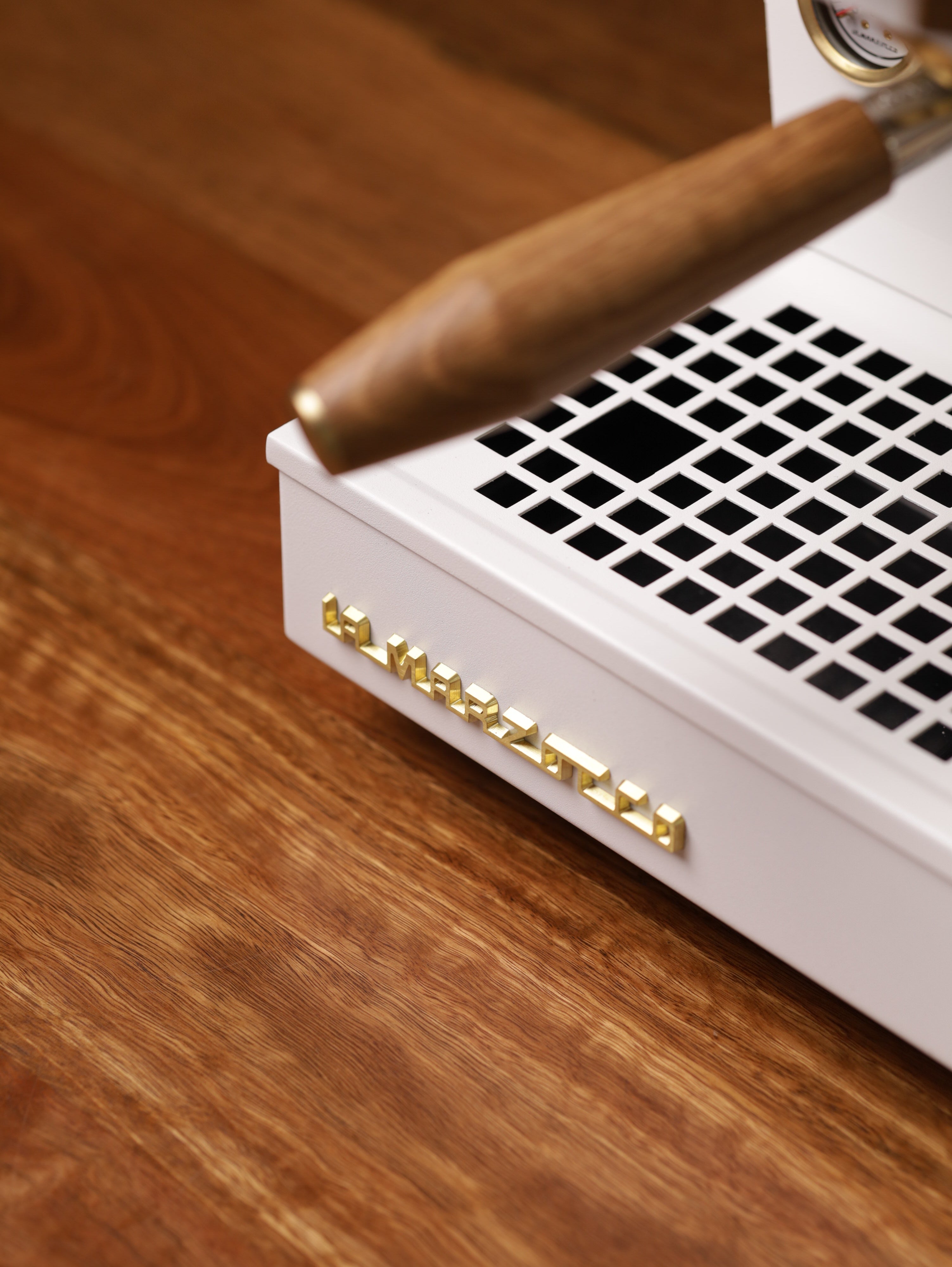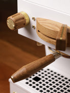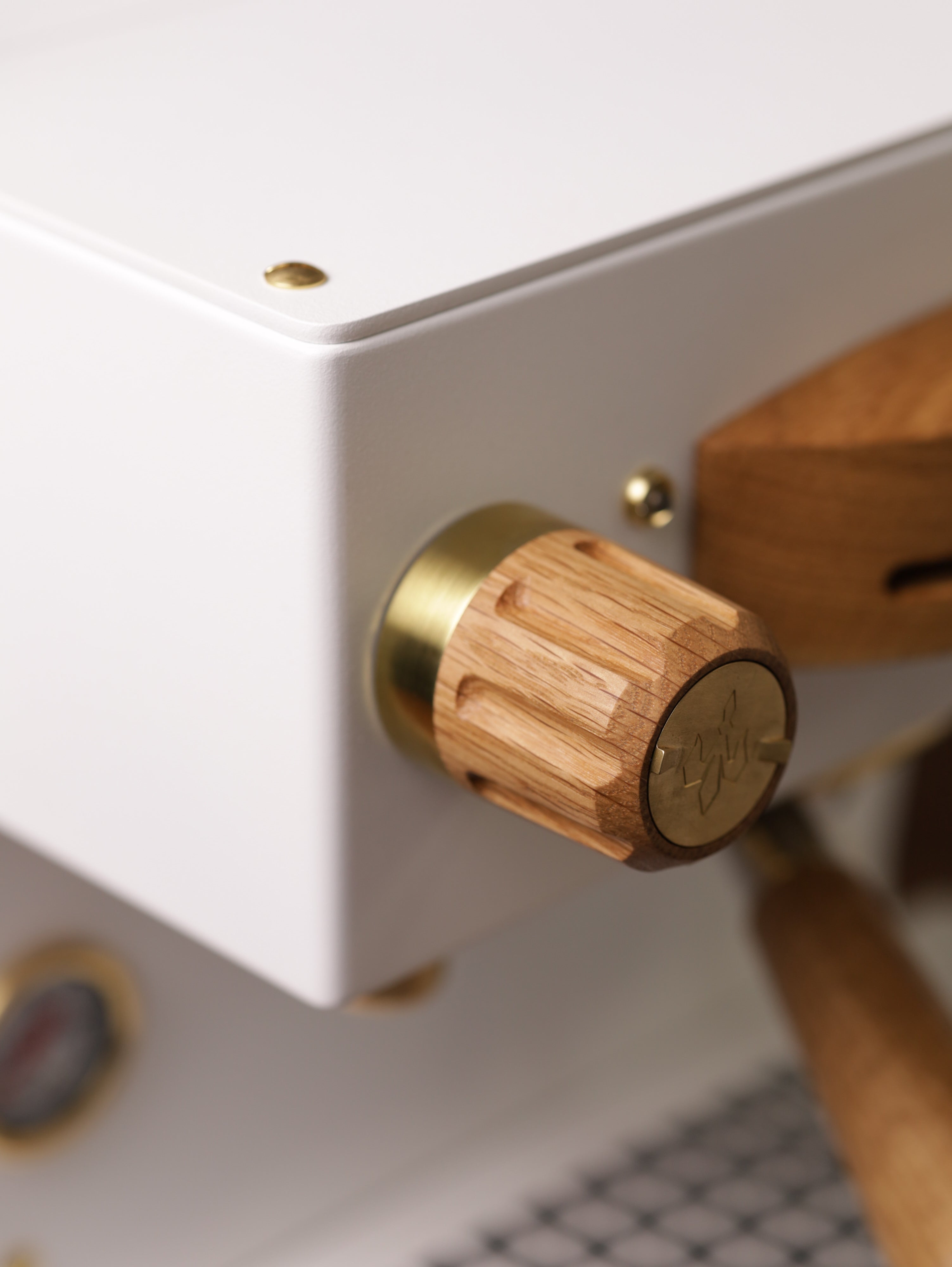 All contact points for this Linea Mini are solid American Oak, including the paddle, paddle surround, steam knobs and portafilter handle.