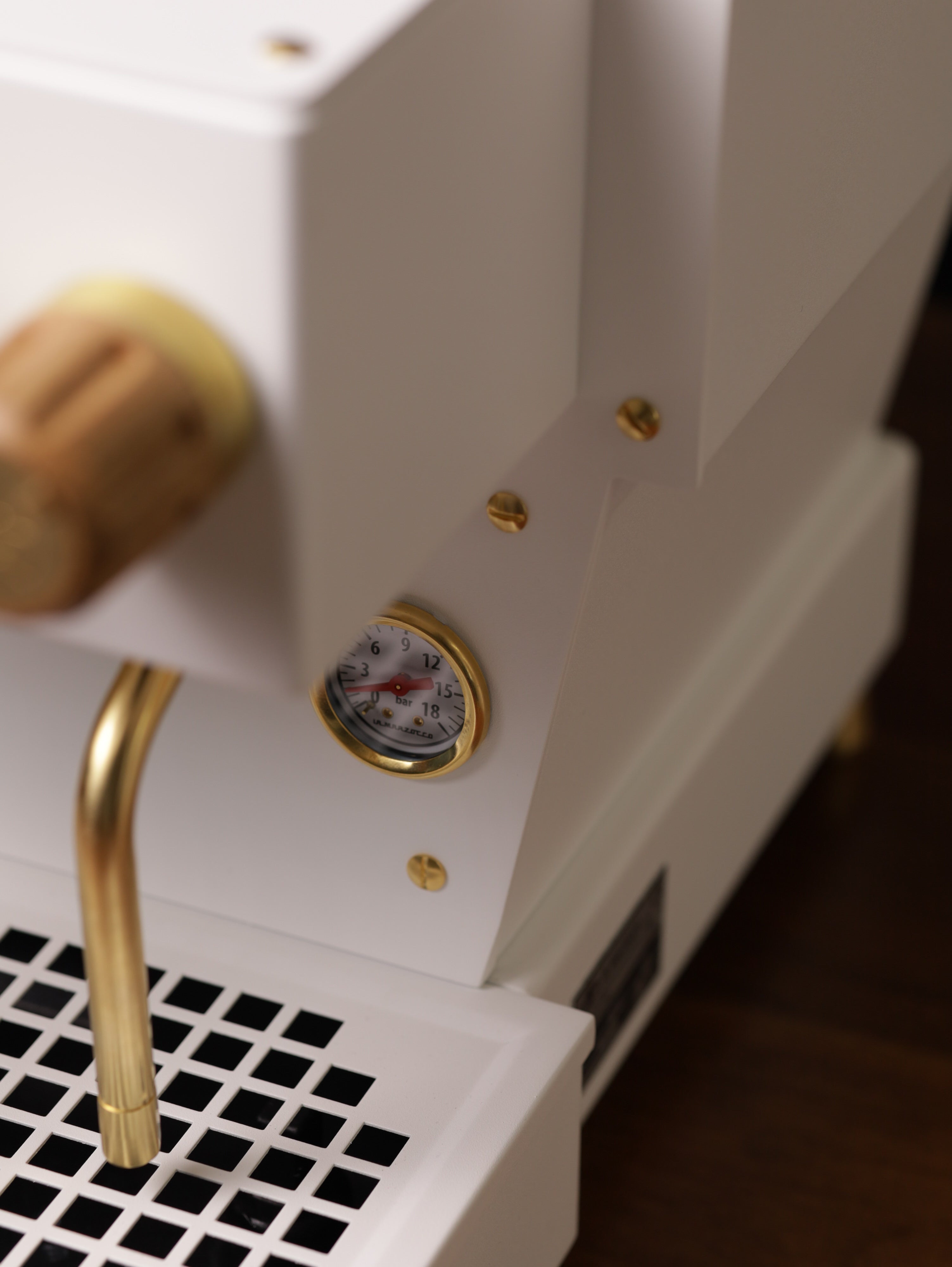 White with full brass coverage including Specht feet, steam wand, bayonet ring and hot water spout.