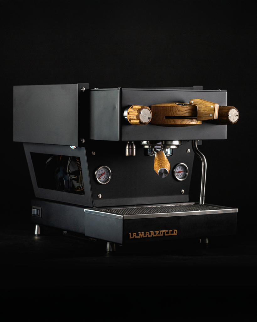 A black, Specht La Marzocco Linea Mini espresso machine with polished brass and walnut wood accents.