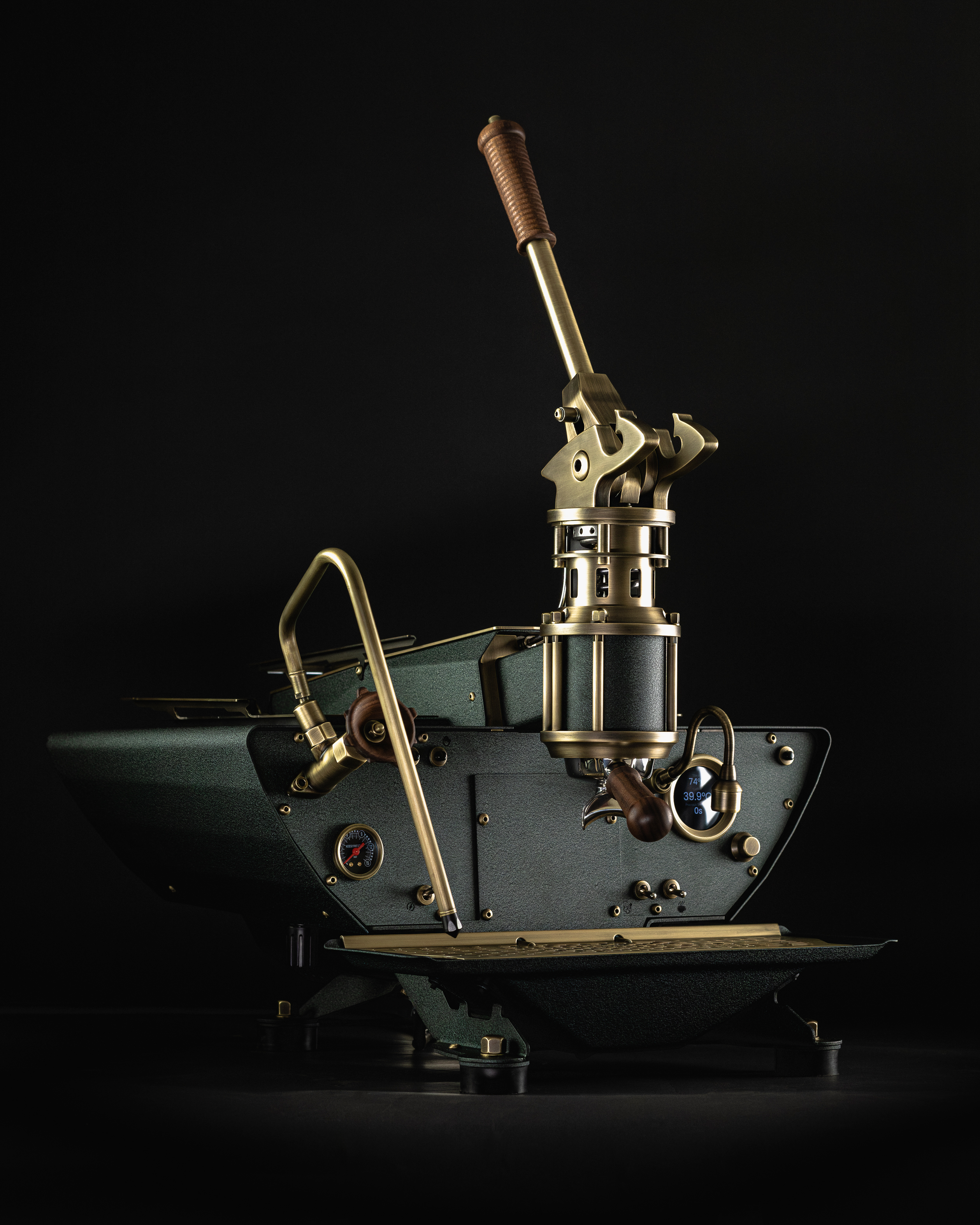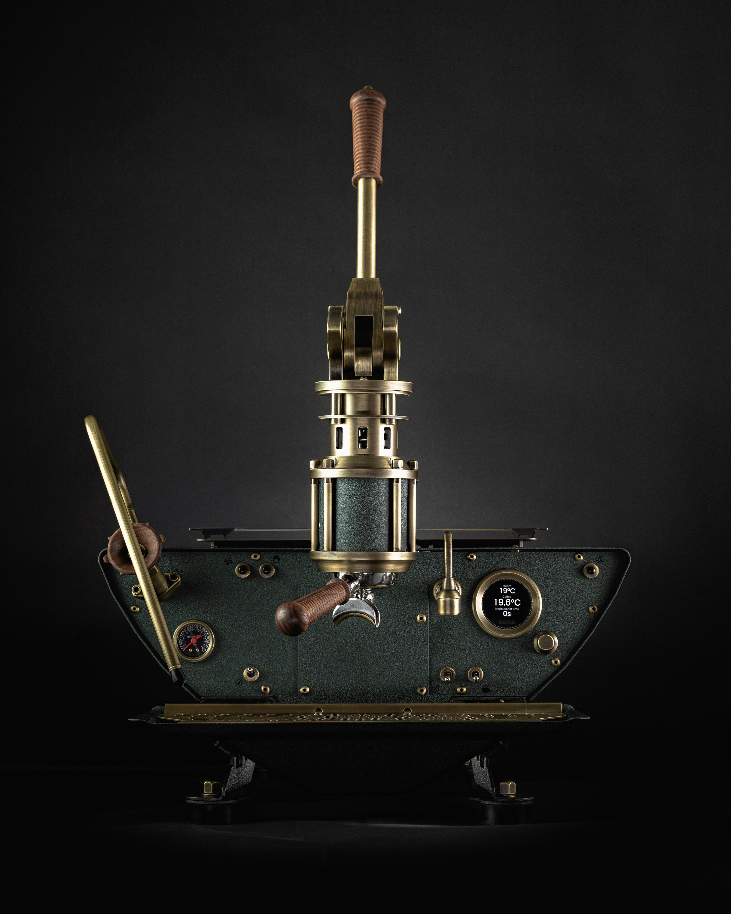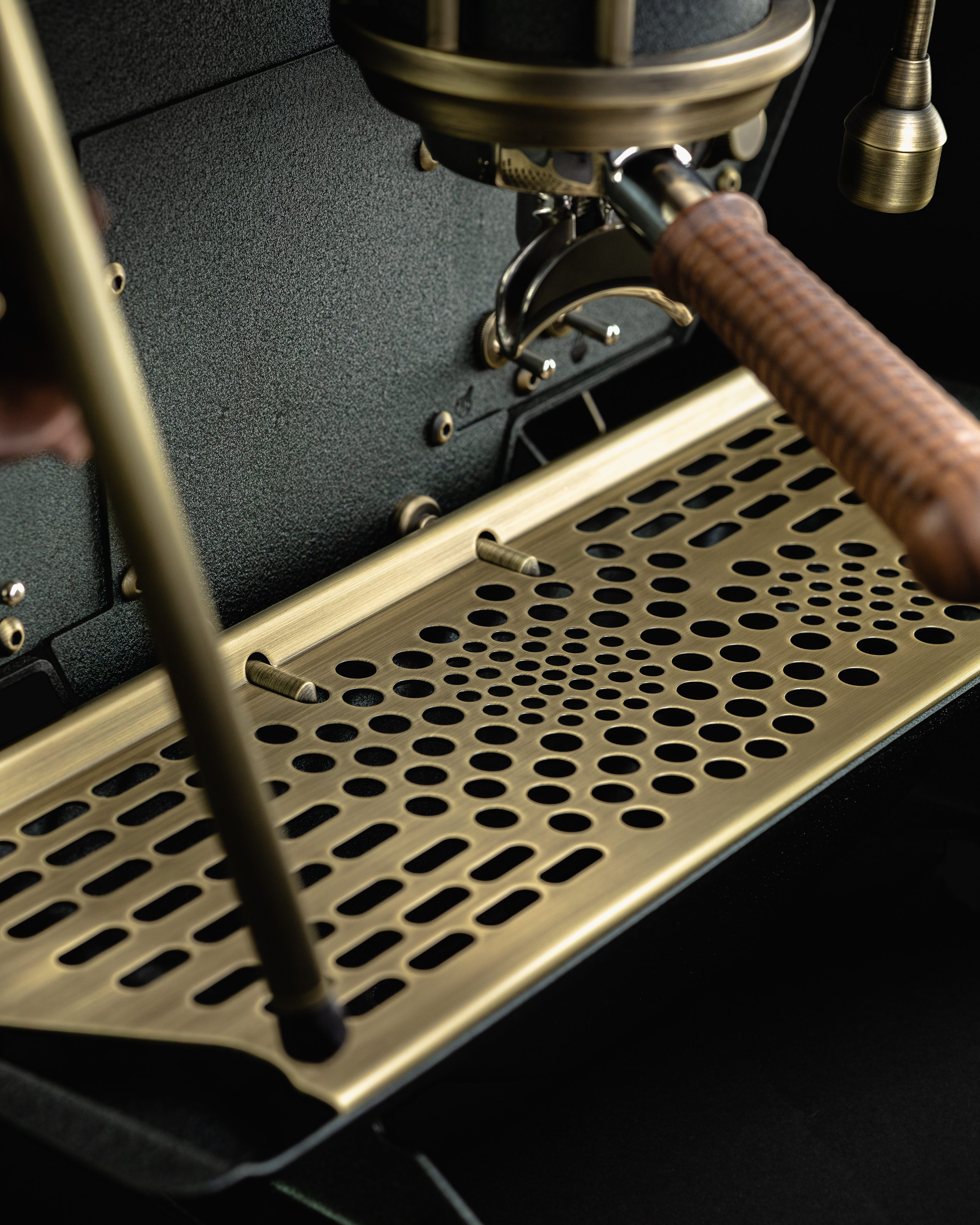 Aged brass is introduced as a bridge between the warmth of walnut and the richness of emerald. Gauge bezels, wands, lever componentry, the drip tray and other select details contribute to the layers of visual complexity.