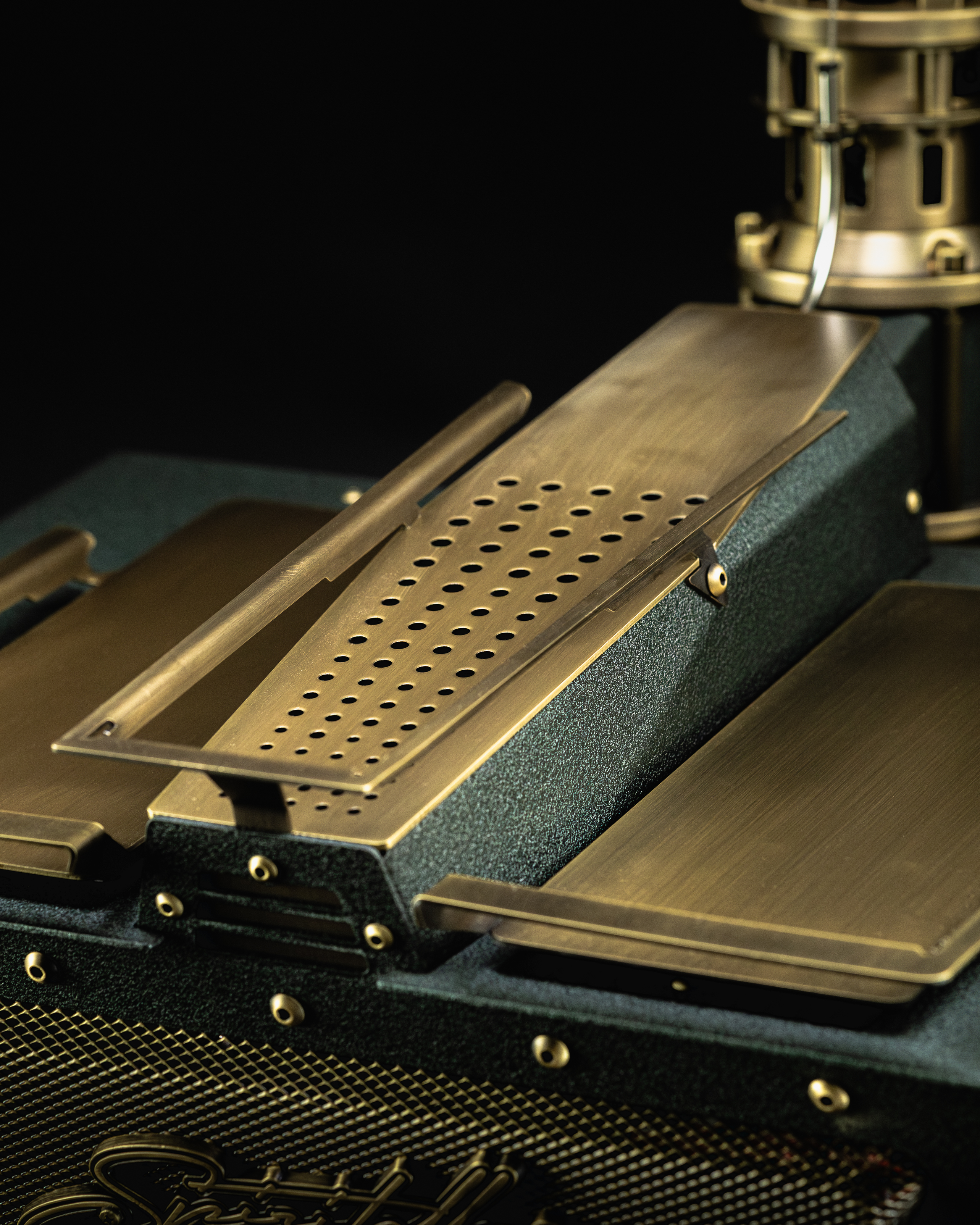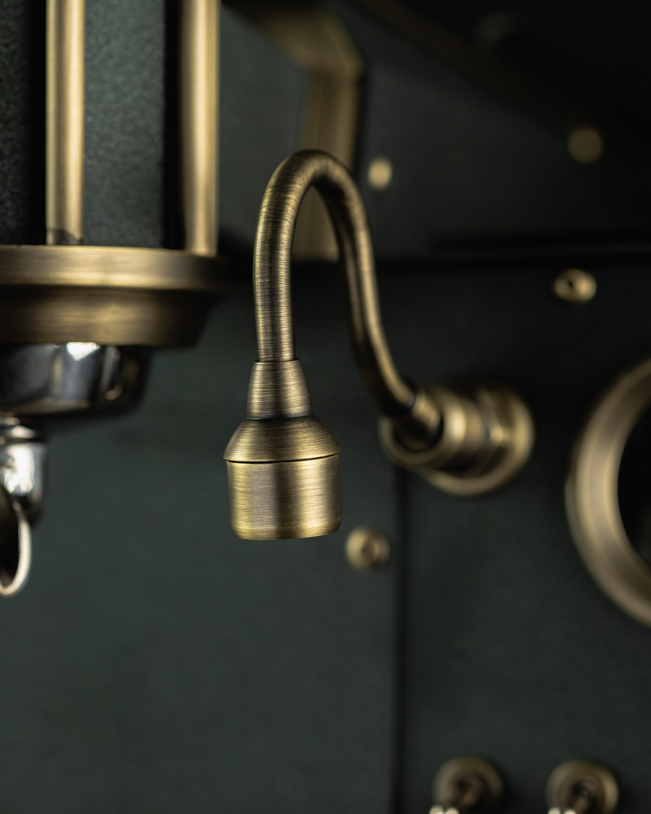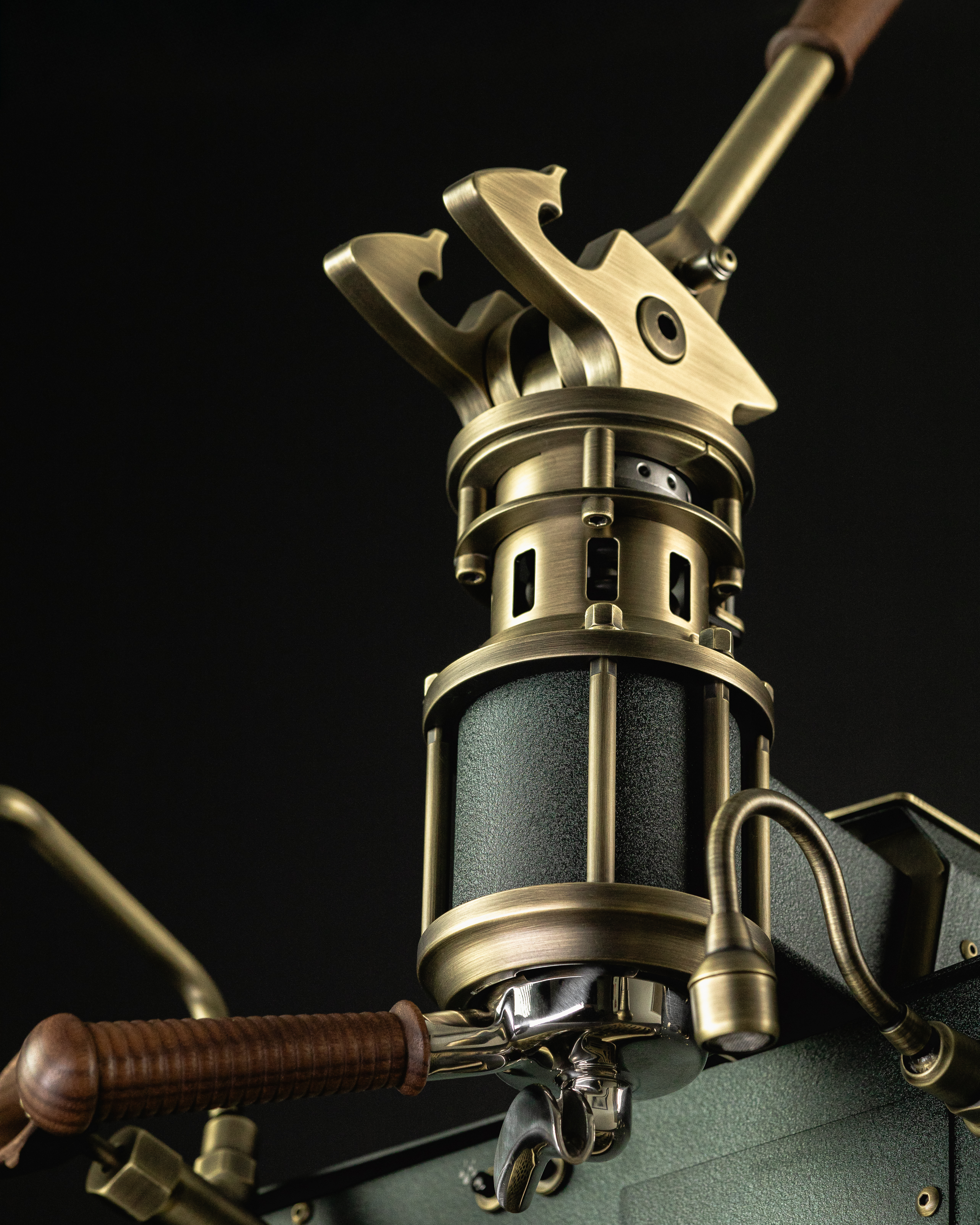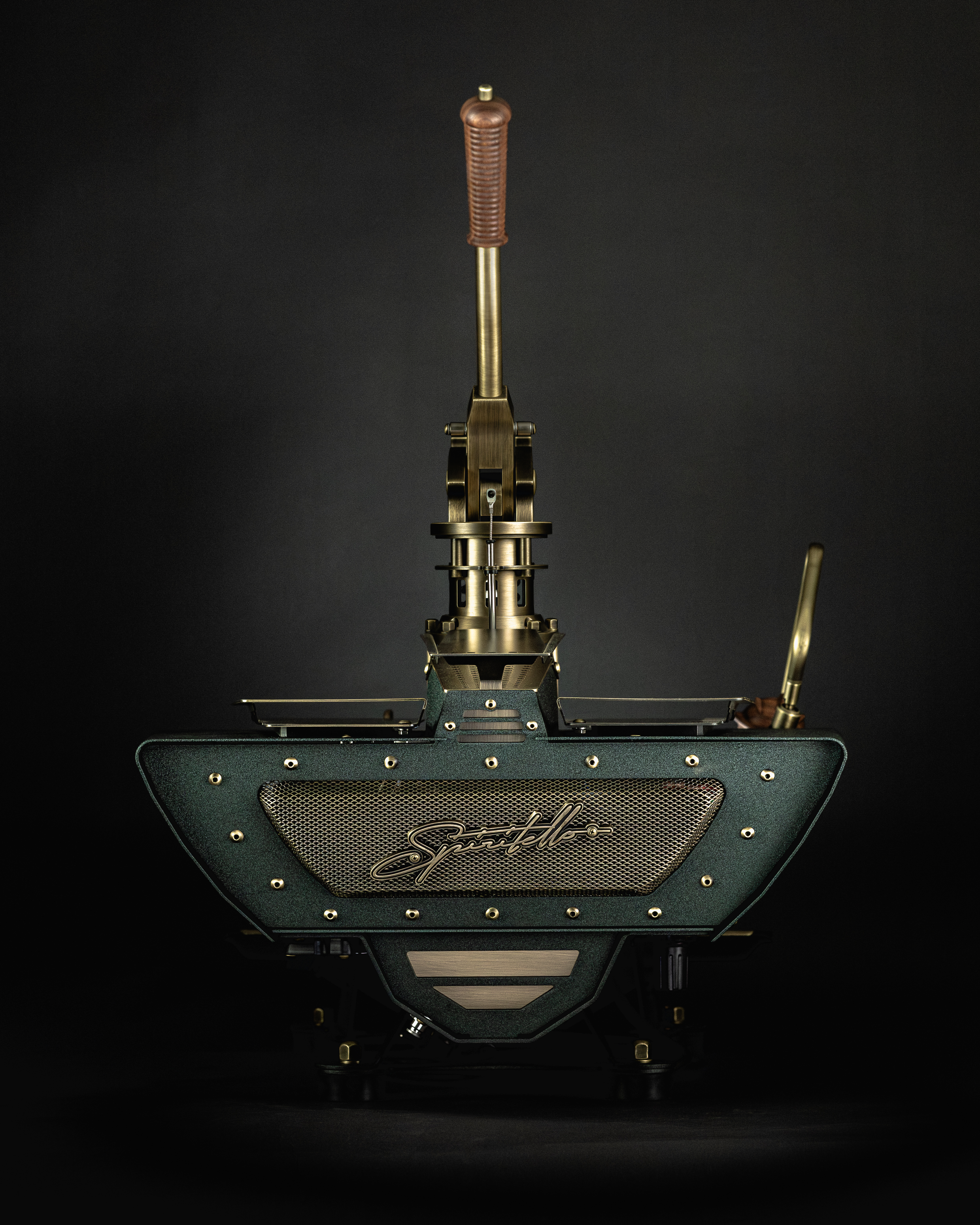Aged brass is introduced as a bridge between the warmth of walnut and the richness of emerald. Gauge bezels, wands, lever componentry, the drip tray and other select details contribute to the layers of visual complexity.