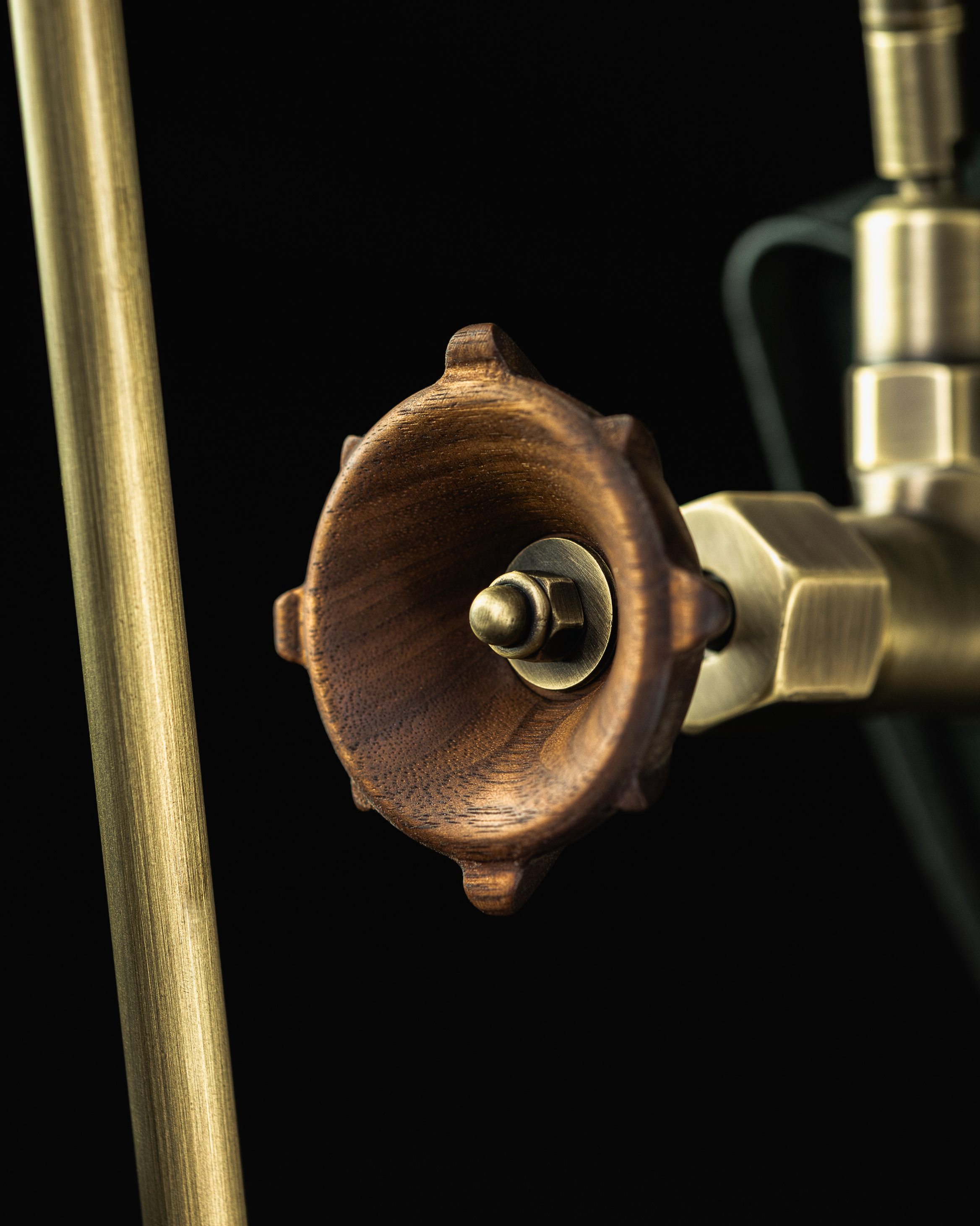 Interactions with its towering lever are mediated through a ribbed, hand-finished walnut grip. The portafilter handle and tulip steam knob are also carved from this prized wood variety. Fine grain structure and warm chocolate-brown tones are a deliberate counterpoint to the cool precision of metallic elements. Each walnut piece is selected for color consistency, shaped to ergonomic perfection, and sealed with food-safe wax and oil that protects, while preserving natural tactile qualities.