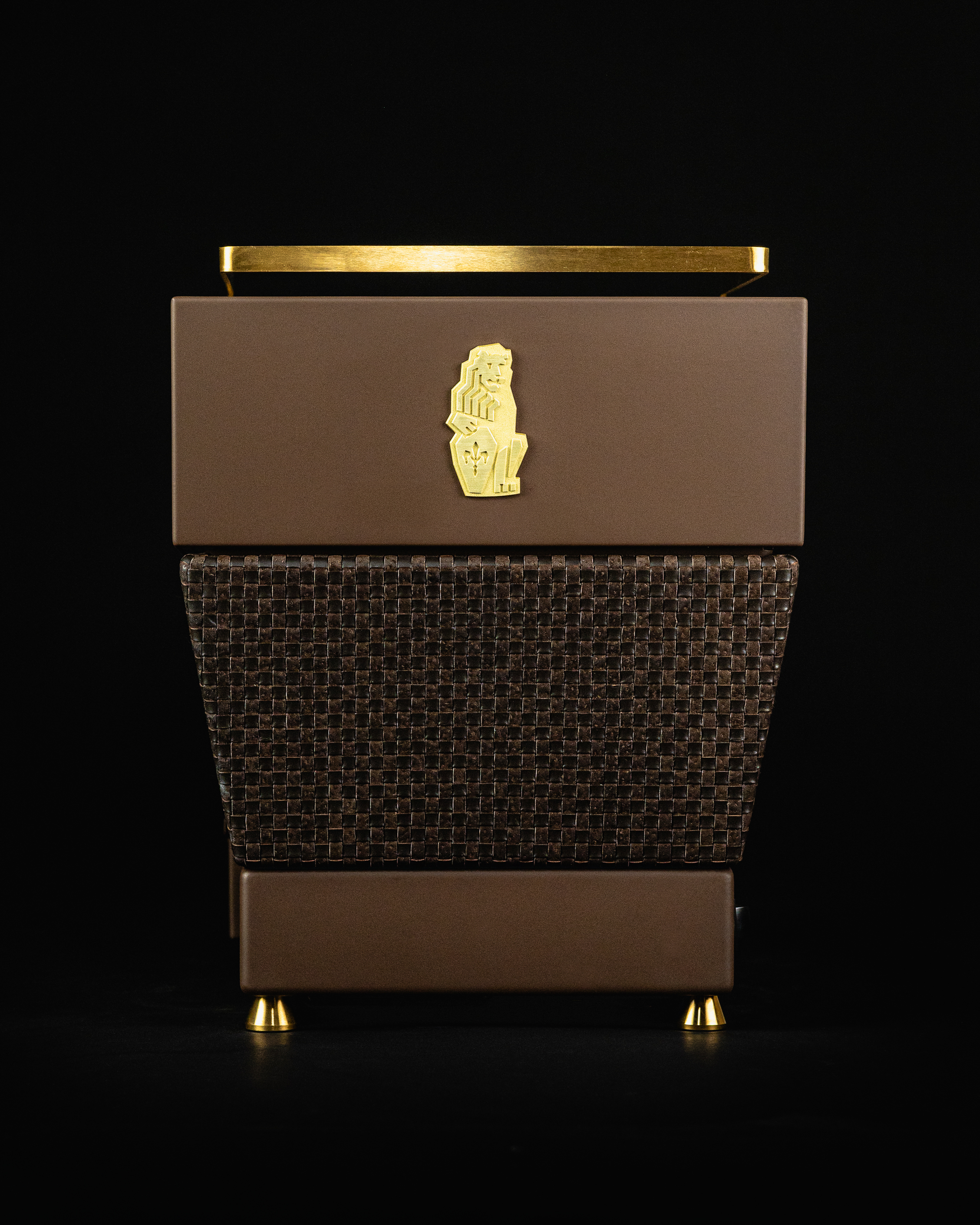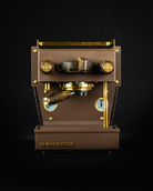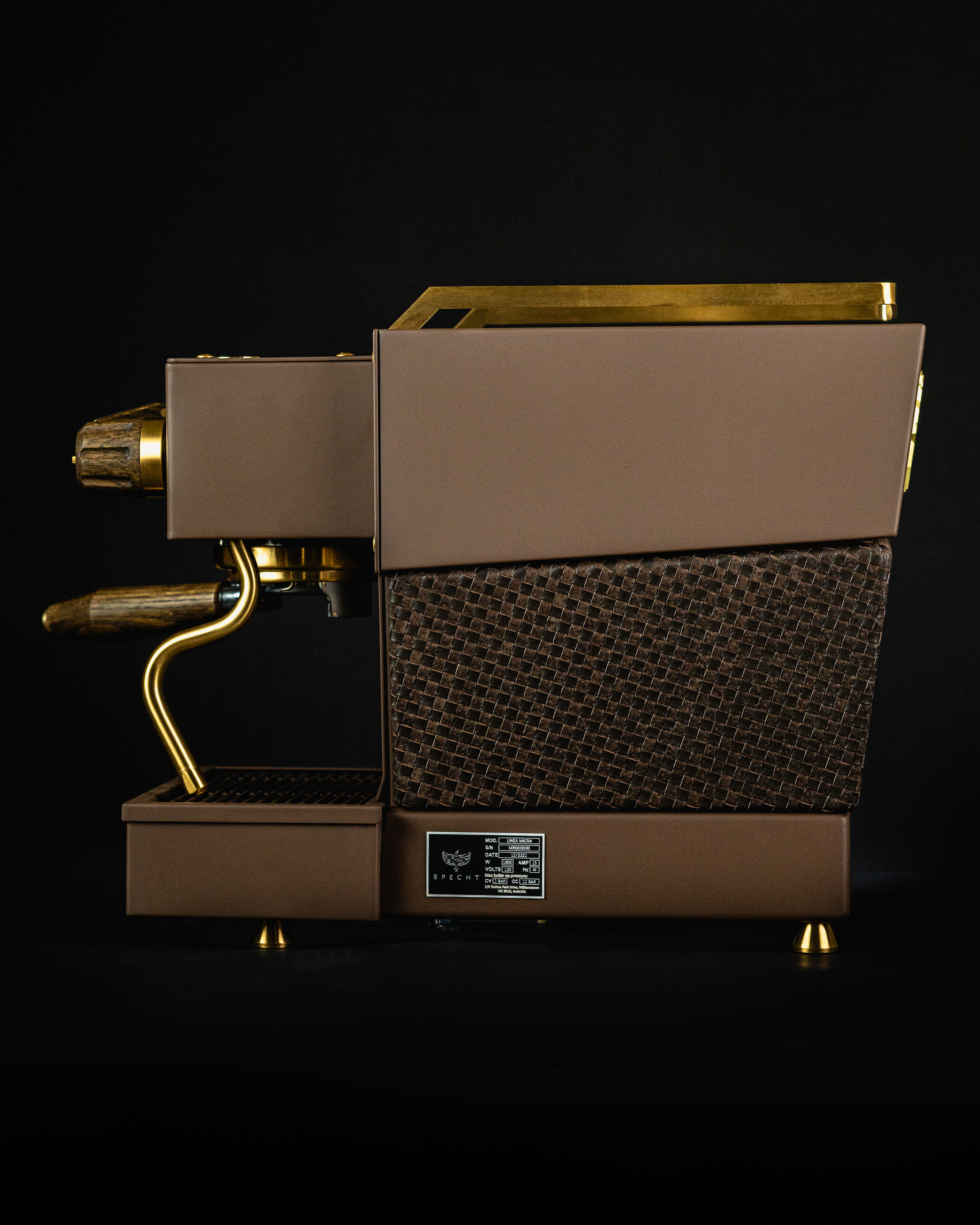Building on this foundation of woven leather, brilliant 24-carat gold gilds our signature floating cup rail, wands, gauge bezels, and fasteners. Gold-encrusted rings and fleur-de-lis faces differentiate the solid oak steam knobs from the chocolate-brown body. These touchpoints have endured our aging process, drawing the figured grain pattern to the fore.