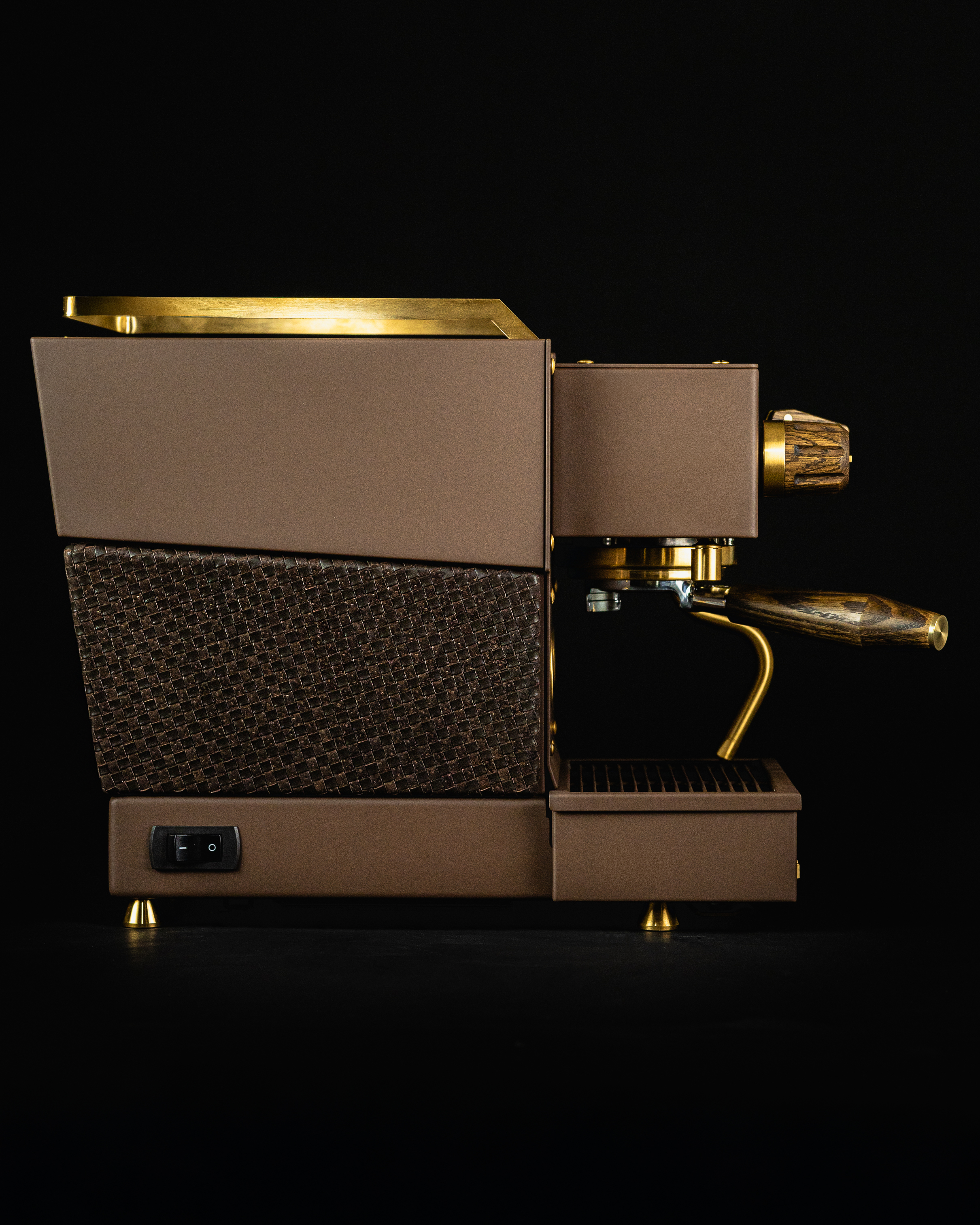 Patiently woven by hand and set in place around the machine's core, the alternating surface texture invites touch - a tactile experience that distinguishes the Woven Kangaroo-leather Specht from almost every other home espresso machine.