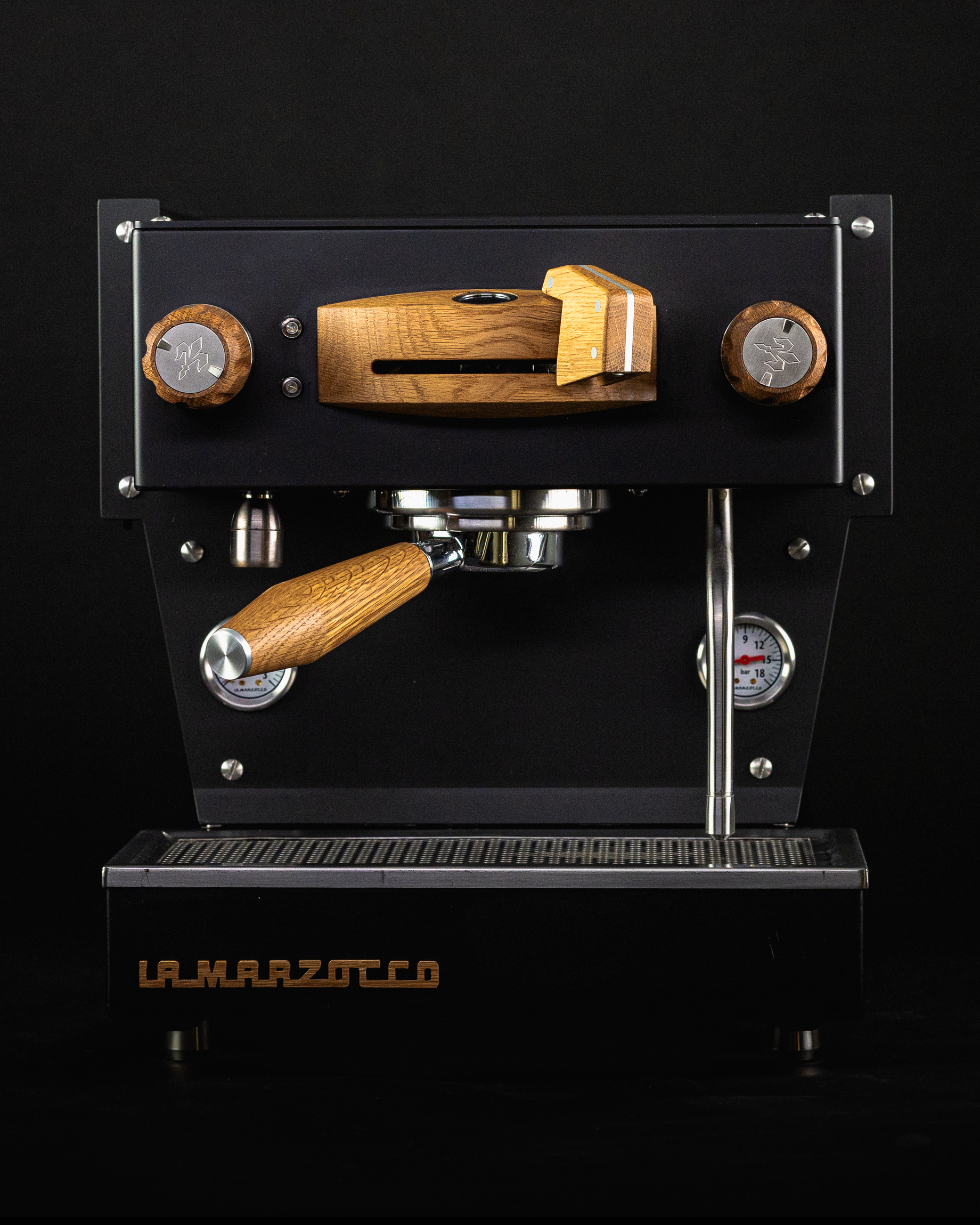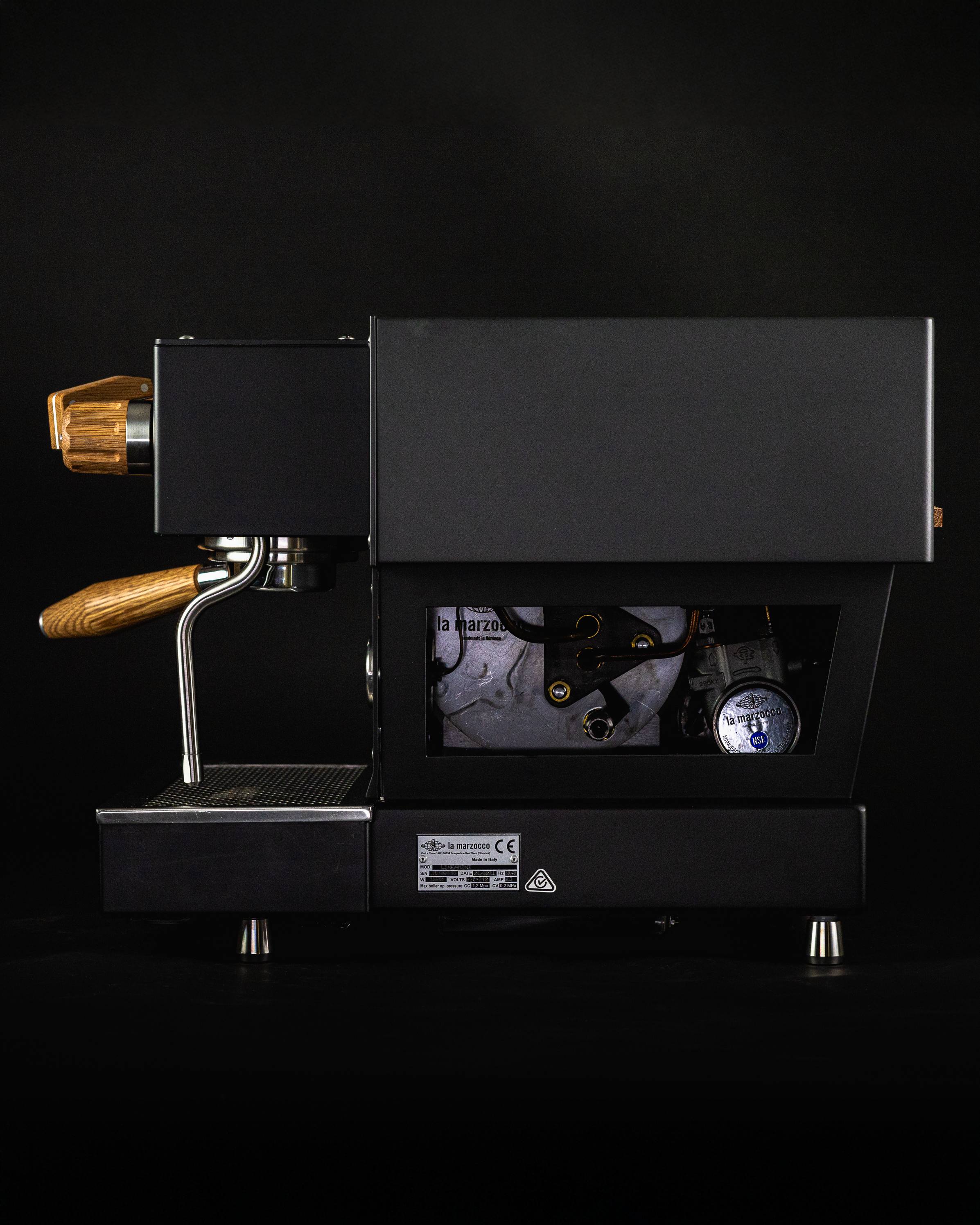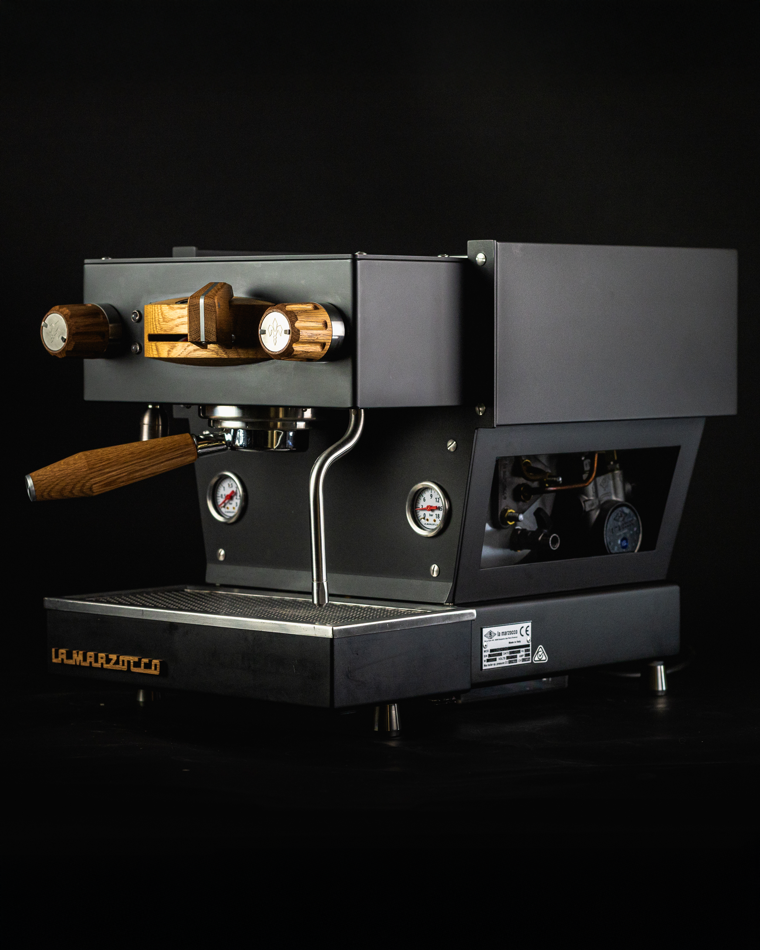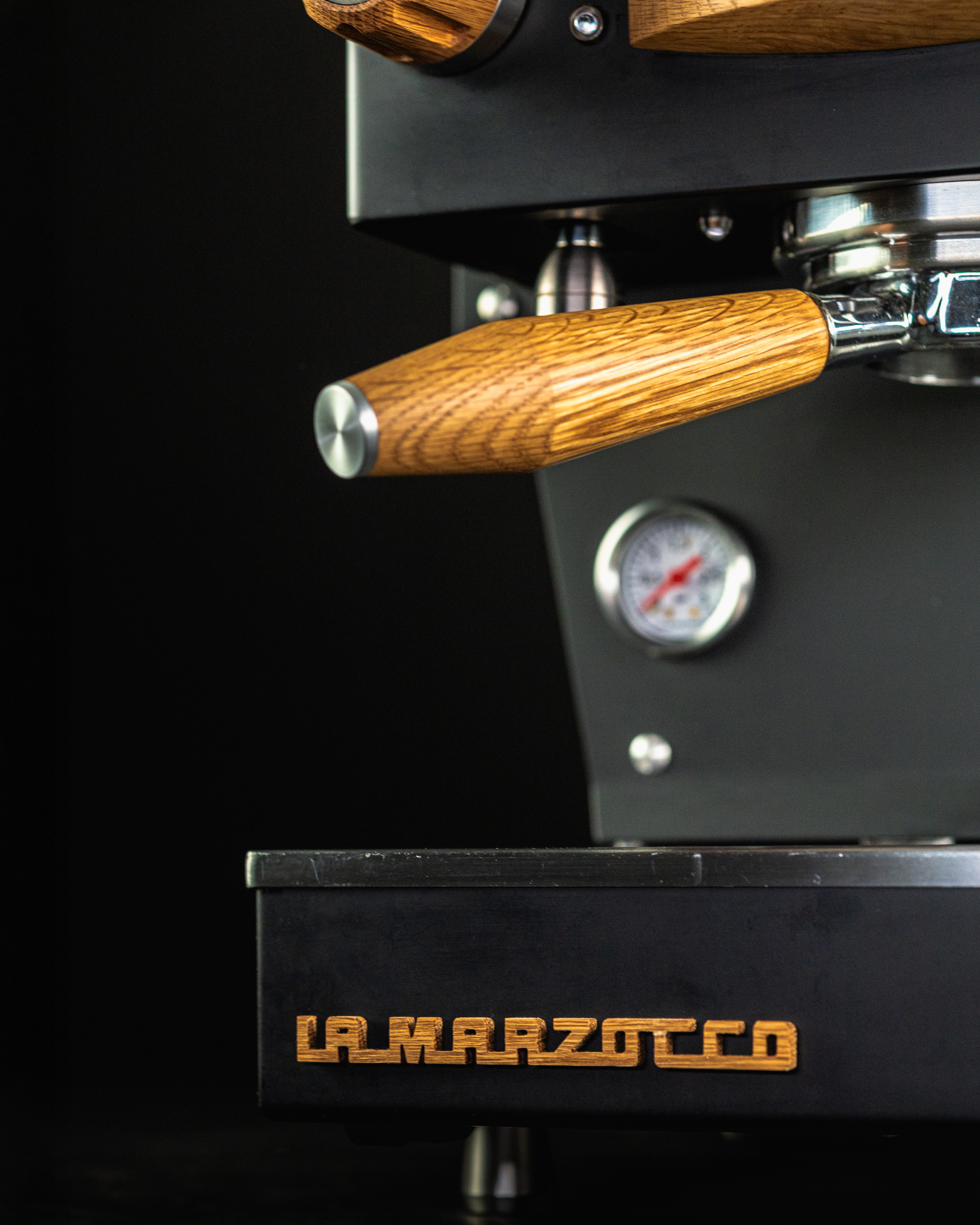 La Marzocco's iconic, original model Linea Mini in matte black with oak touch points and stainless steel highlights.