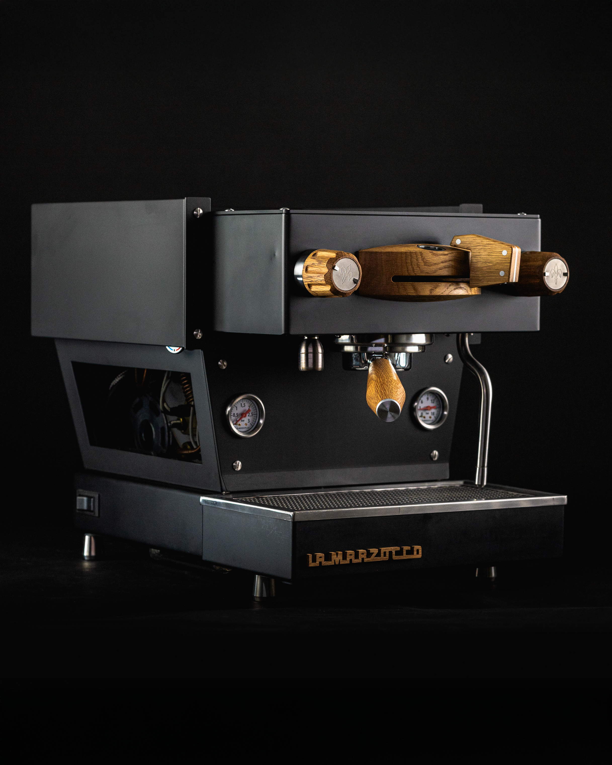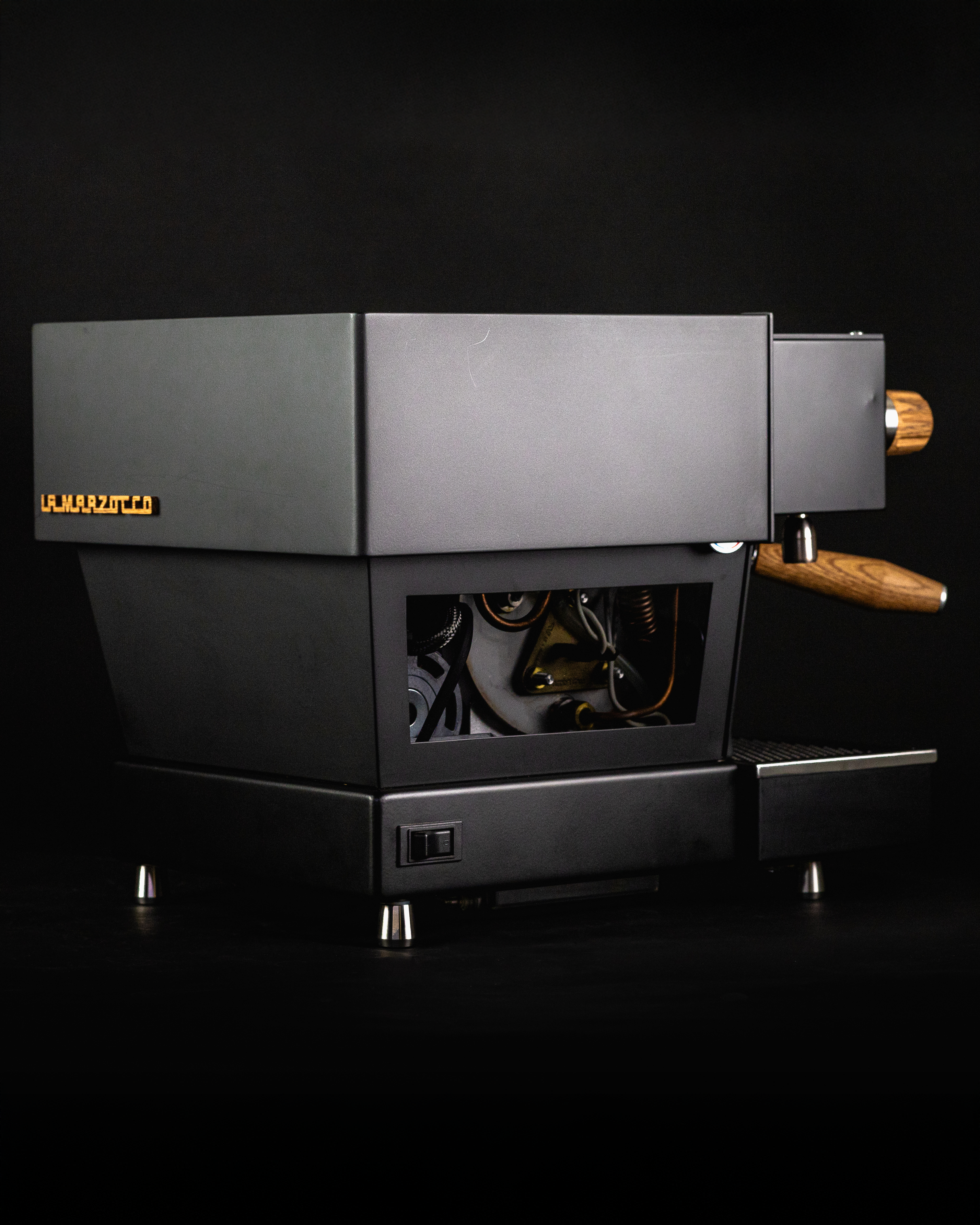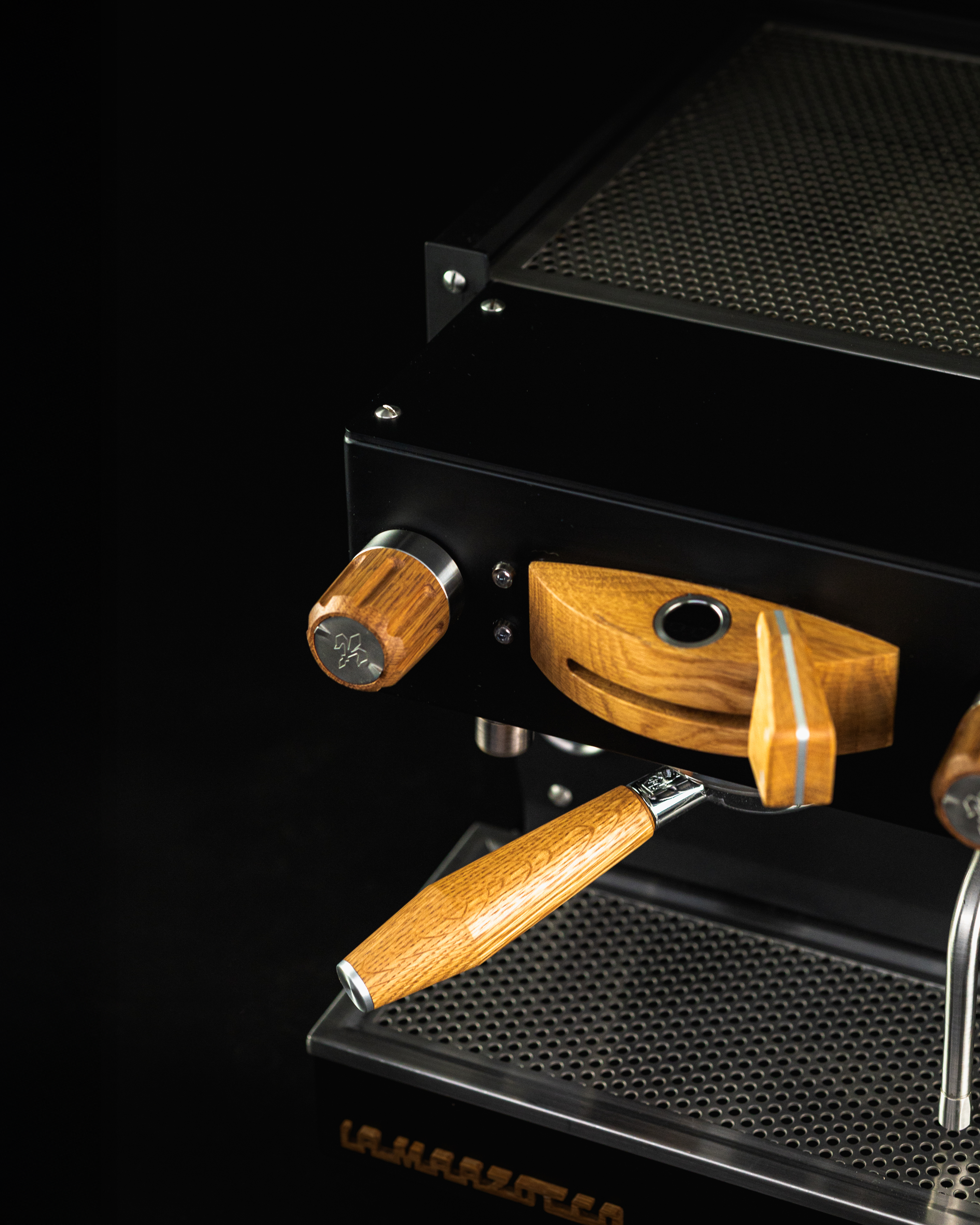 La Marzocco's iconic, original model Linea Mini in matte black with oak touch points and stainless steel highlights.