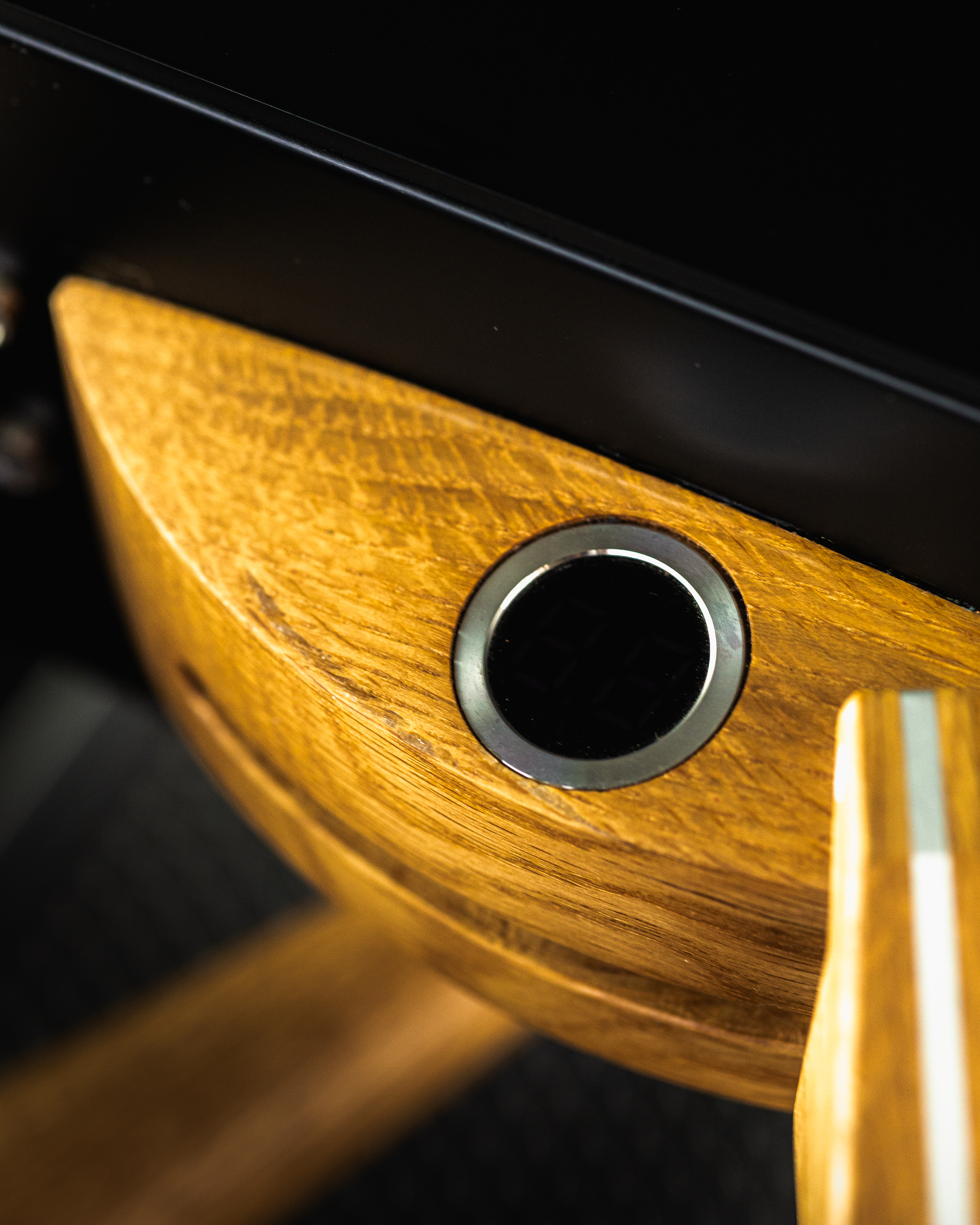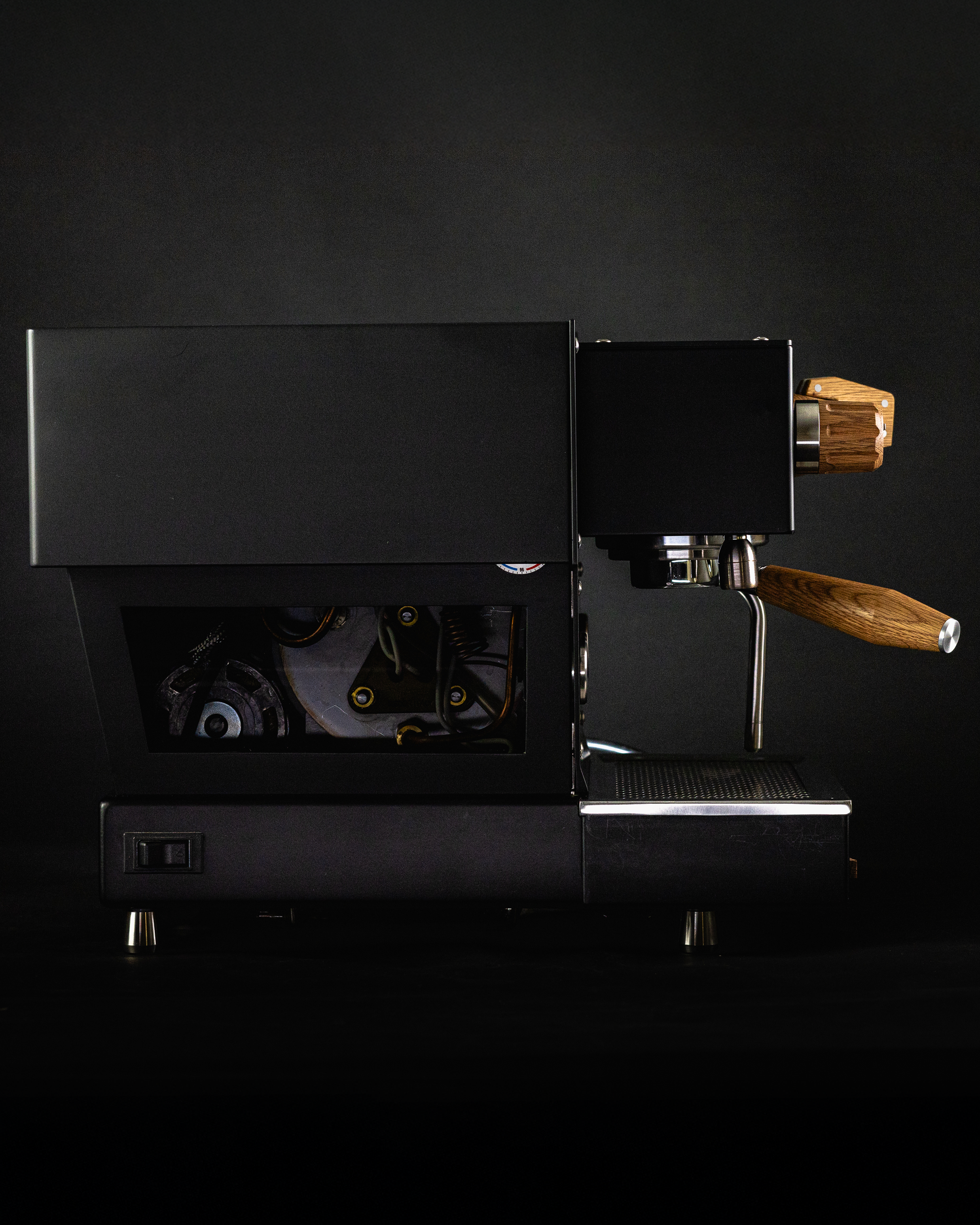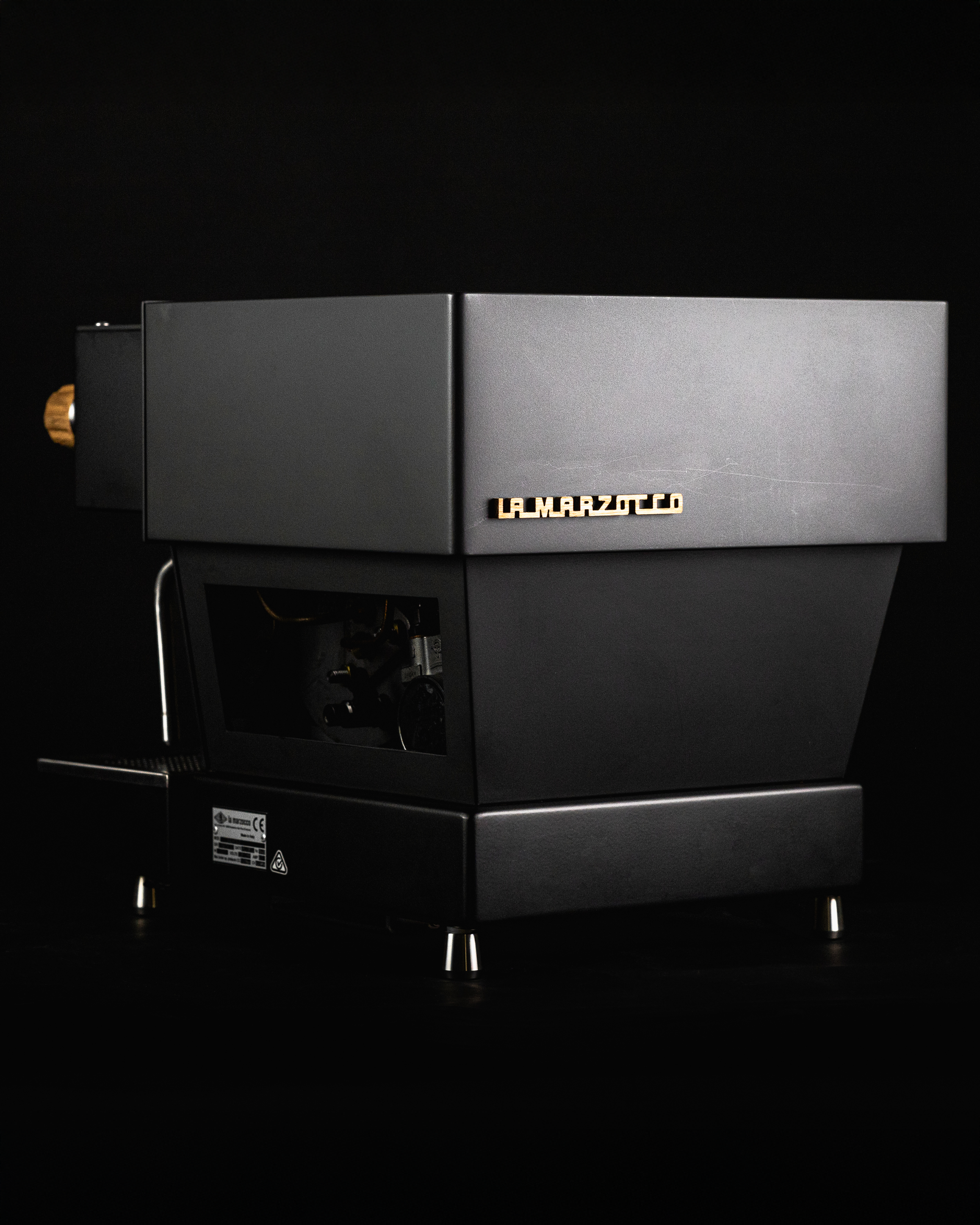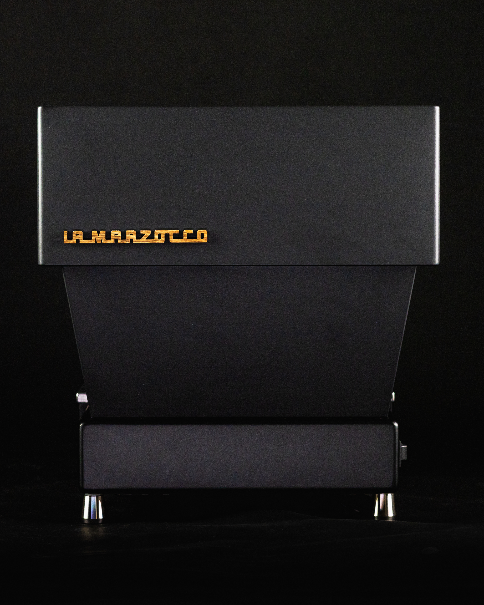 La Marzocco's iconic, original model Linea Mini in matte black with oak touch points and stainless steel highlights.